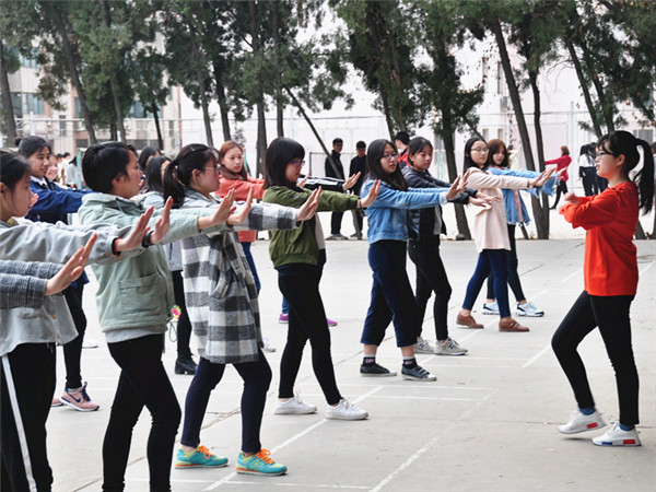 “我是男生,我也舞的很美”。步调的不统一、动作的不协调,也难敌同学们成百上千次的练习。 一次次的抬手,一次次的定格,即使肌肉酸痛、全身疲惫,在坚强的意志下,这都不算什么。