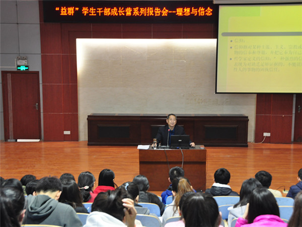 3月21日下午,文法系益群学生干部成长营在模拟法庭举办“理想与信念”报告会。文法系党总支书记马福泉为主讲人,益群学生干部成长营成员、学生会主要学生干部参加。