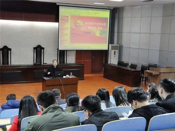 为落实好“组织集中学习,打牢思想基础”这一专题组织生活会和民主评议党员的环节,增强开好组织生活和搞好民主评议的主动性和自觉性,2月28日下午,在文法系模拟法庭,文法系党总支书记马福泉为全系69名党员上了一场题为《中国共产党党内监督条例解读》的党课。