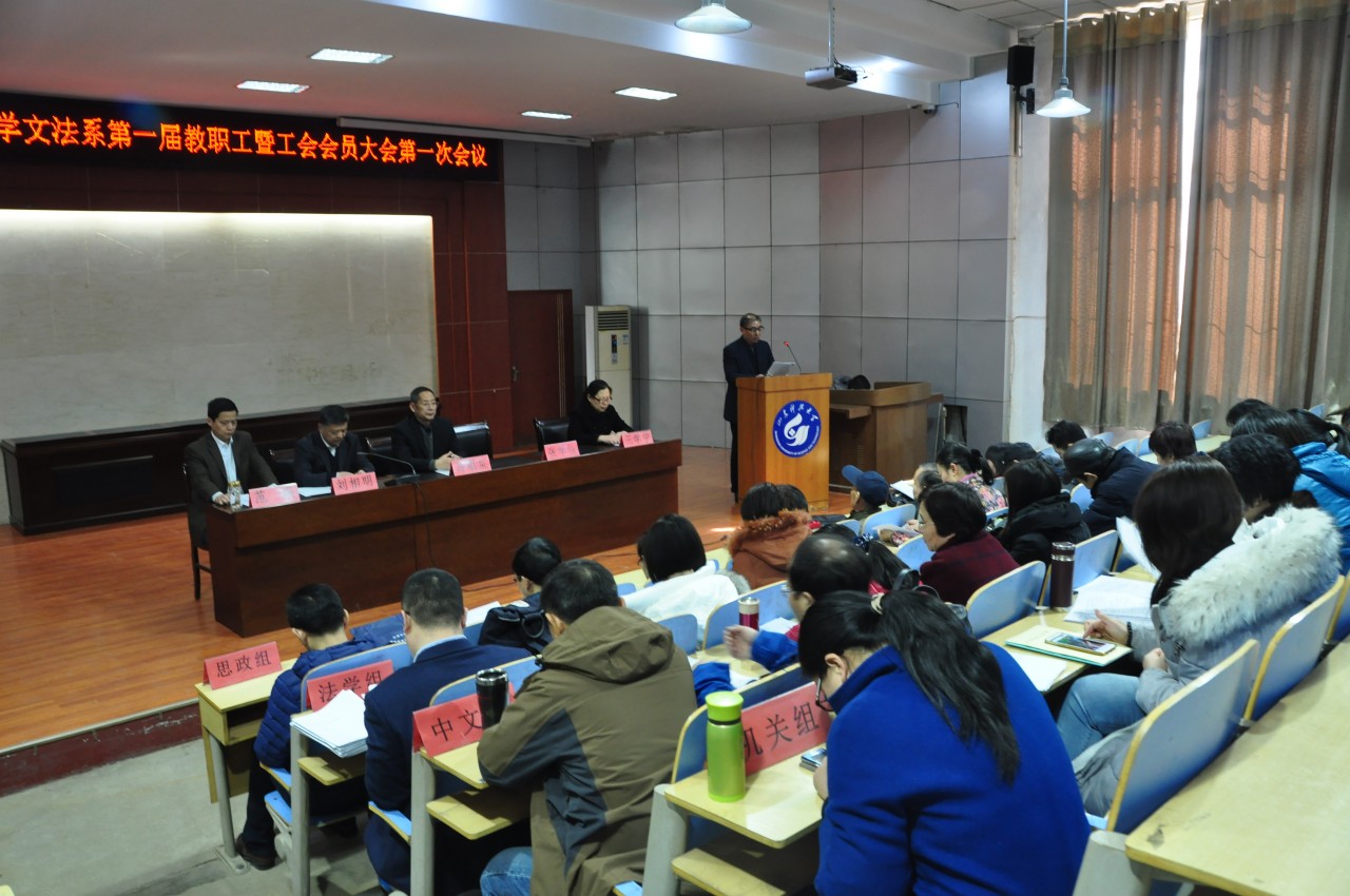 3月2日下午,文法系在模拟法庭召开第一届教职工暨工会会员大会第一次会议,大会由文法系党总支副书记兼副主任刘相明主持。