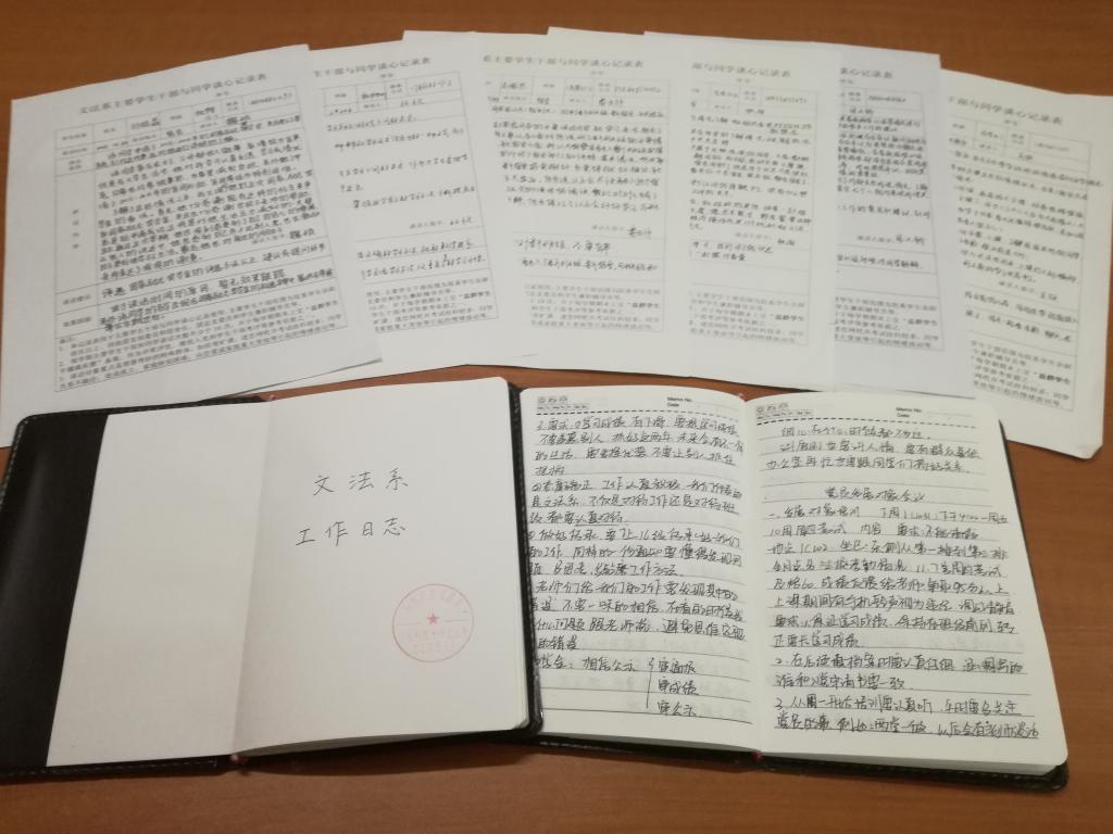 根据学期初计划,文法系实行主要学生干部与同学谈心制度,具体工作由“益群学生干部成长营”负责组织实施。结合期中教学检查工作,近日系团总支对谈心记录表进行检查,监督主要学生干部工作落实情况,了解学生思想动态。
