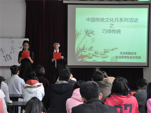 11月17日下午,由文法系团总支主办、学生会承办的“巧绎传统”舞台剧比赛在文秘情景实训室成功举行。