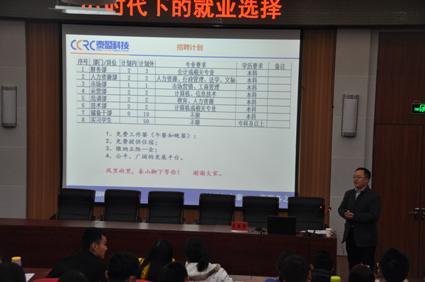 11月22日,我校校友、泰盈科技(集团)有限公司总经理助理、财务总监王玉升和招聘部经理尹作斌等一行4人到文法系举办专场招聘会。本次招聘秘书学、行政管理、人力资源管理、会计、计算机和法学等专业岗位33个,实习岗位50个。
