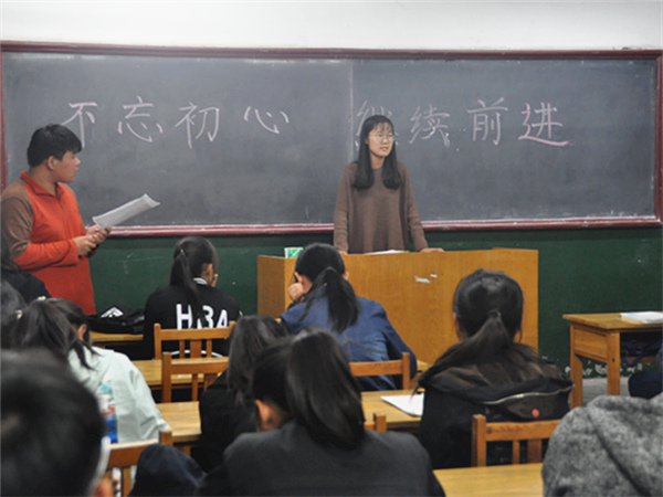 大学,铭记初心,回归梦想,勇敢向前。10月17日晚,文法系新生班级在自习室内开展主题为“不忘初心,继续前进”的主题班会,各班班长担任主持人。