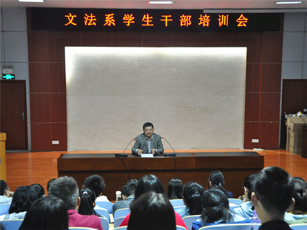 为进一步加强学生干部队伍建设, 10月13日下午,文法系在模拟法庭召开学生干部培训会,各班班长、团支书、学生会的主要学生干部、团总支委员参加培训。系党总支副书记兼副主任刘相明做了题为“以学生发展理论为指导做好学生服务工作”的报告。