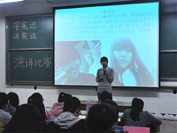 10月26日,由文法系团总支主办、学生会承办的“学宪法 讲宪法”演讲比赛在教室1C102举行,系团总支老师郭艳培和法学教研室老师王新娟担任嘉宾。