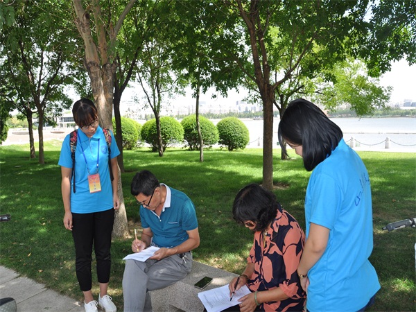 就湿地相关问题,队员们在公园里进行问卷调查。