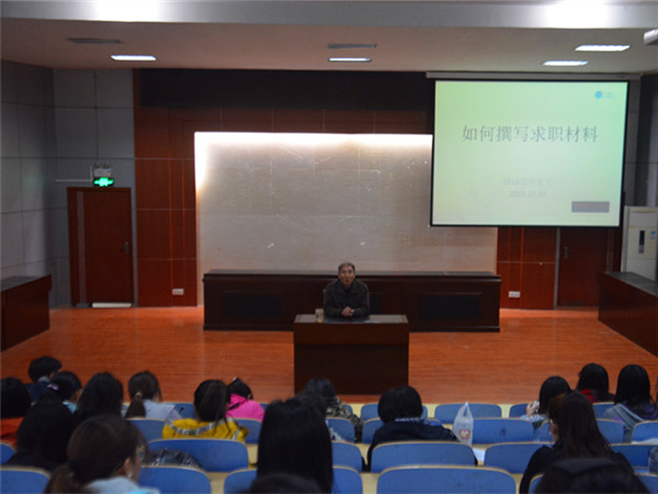 为提高2016届毕业生的就业率,进一步落实好《关于做好毕业生就业创业工作的通知》,学习求职技巧,增加就业资本,10月30日,文法系主任张学银在模拟法庭为毕业生做了一场《如何撰写求职材料》的报告会。