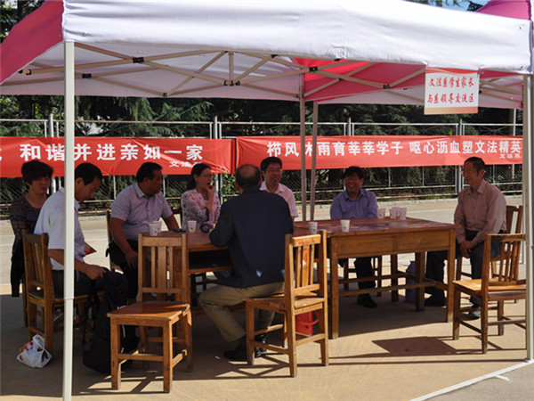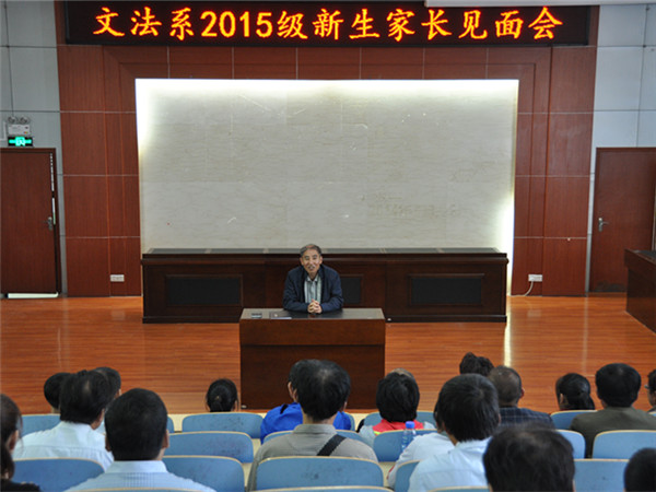 文法系今年继续在新生报到现场设置“学生家长与系领导交流区”进行现场交流的基础上,上午11:30,在模拟法庭举办了“文法系2015级新生家长见面会”,系主任张学银、党总支书记马福泉出席了此次会议,近百名学生家长参加。
