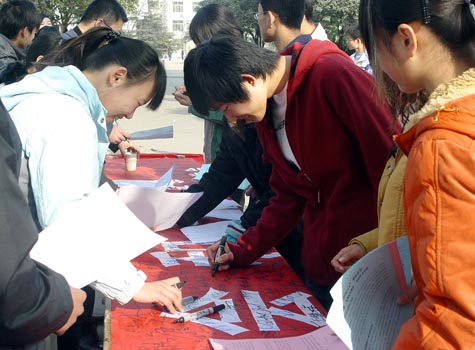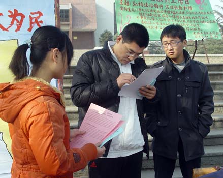 2010年是实施“五五”普法规划的检查验收年,也是“12·4”全国法制宣传日确立十周年。为贯彻上级普法宣传文件精神,加大法制教育建设,增强大学生的法制观念,12月4日,校区(学院)文法系在西校园礼堂前进行普法宣传主题签名活动。